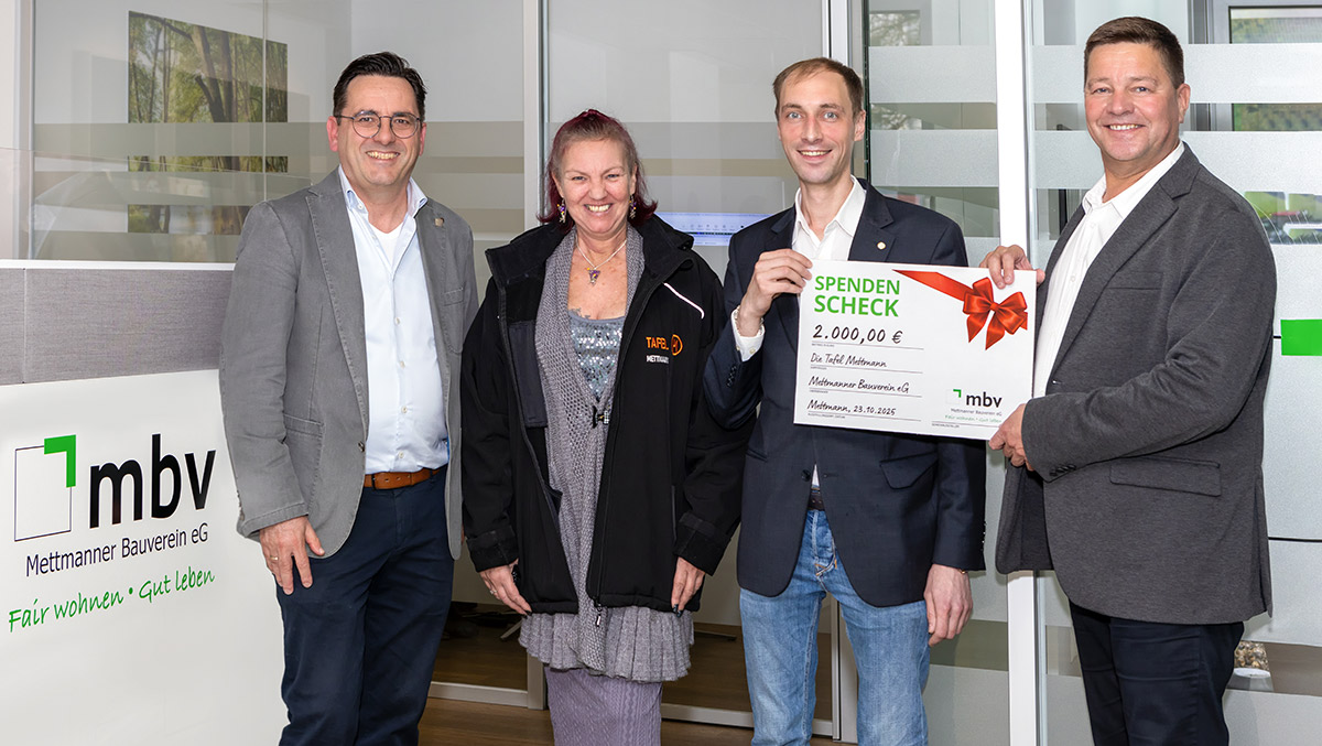 „Sie und Ihr Team leisten tolle Arbeit für hilfsbedürftige Menschen hier in Mettmann. Das möchten wir gerne mit unserer Spende unterstützen“, sagte Michael Müller bei der Scheckübergabe. Die Spendensumme in Höhe von 2.000 Euro stammt aus dem Verkauf von Wertmarken, die unsere Mitglieder auf der Jubiläumsfeier unserer Genossenschaft für einen Euro pro Stück erwerben und gegen Speisen und Getränke einlösen konnten. Die Feier zum 120-jährigen Bestehen unserer MBV eG fand am 26. September 2025 statt.
