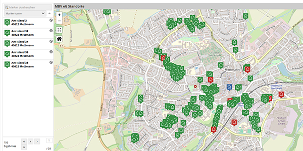 Einen perfekten Überblick des Immobilienbestands der MBV eG, der MBV Bau und Betreuung GmbH sowie der MBV Königshof GmbH haben wir mit einer interaktiven Standortkarte bereitgestellt.